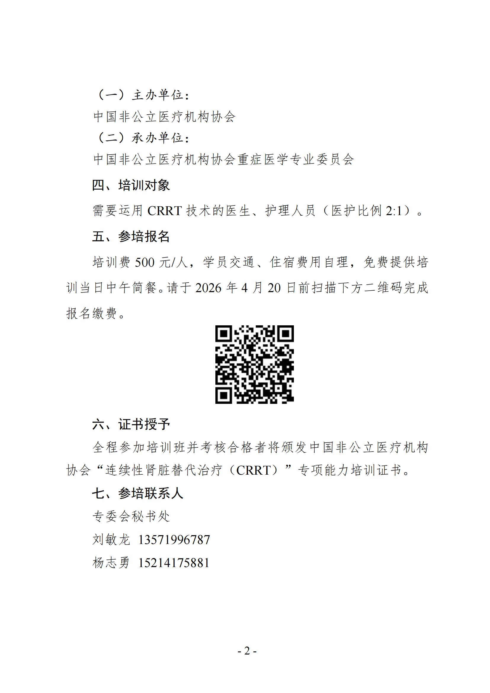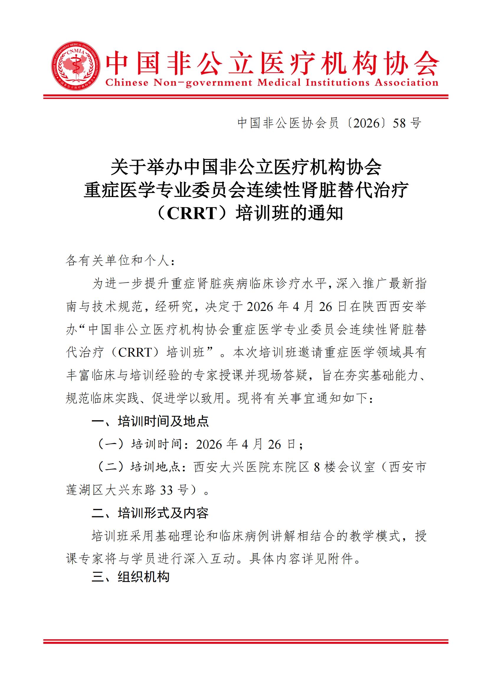 關于舉辦中國非公立醫療機構協會重癥醫學專業委員會連續性腎臟替代治療(CRRT)培訓班的通知